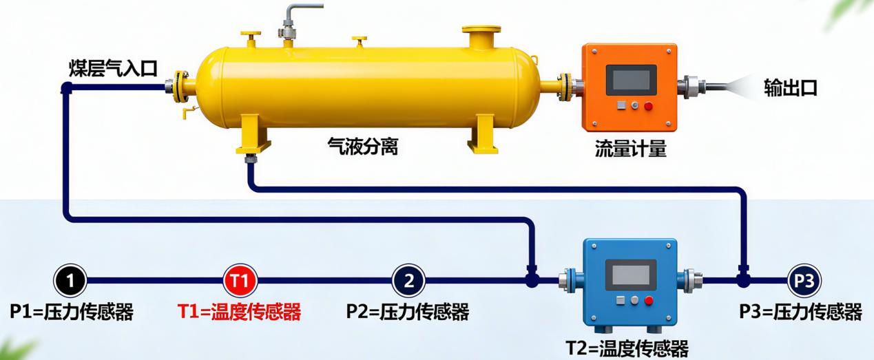 中石油保4集气站通过技术融合实现无人值守监控,该站承担20口井气体处理任务,实施步骤如下:首先,在核心设备部署传感器:压缩机电机处装功率传感器监测功率,分离器进出口装压力传感器监测分离前后压力,冷却器出口装温度传感器监测气体温度,外输管线装流量传感器监测外输量,所有传感器通过RS485总线连至站内可编程逻辑控制器控制柜。其次,可编程逻辑控制器模块通过控制线连接压缩机接触器、分离器排污阀、外输泵变频器,实现设备启停与参数调节;同时通过光纤模块与远程中心通信,上传参数数据并接收控制指令。之后,远程中心搭建监测平台,实时显示设备参数,当压缩机功率异常升高时,系统分析是否因分离器出口压力过高导致:若压力超标,中心向可编程逻辑控制器发送降频与排污指令,可编程逻辑控制器调节压缩机变频器降速,控制分离器排污阀开启排积液降压。集气站工艺流程与监测点分布如图2所示,明确传感器与控制设备部署位置,该站通过此系统实现无人值守稳定运行。