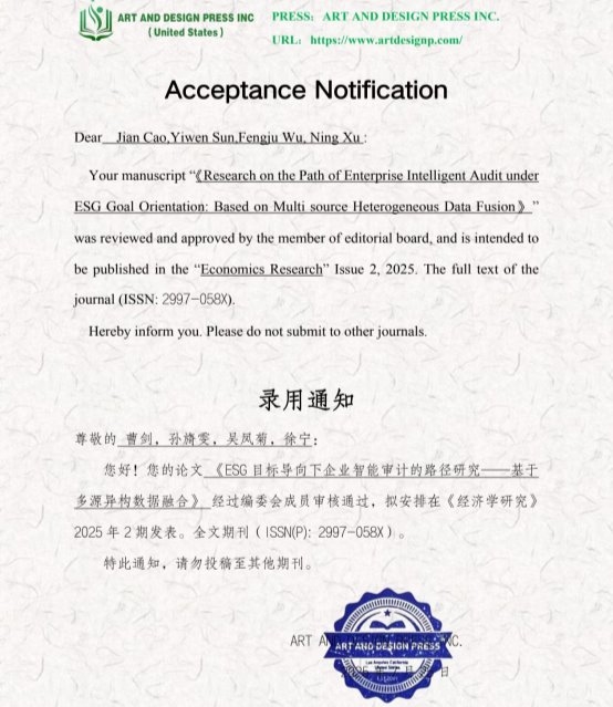 依托学校优质科研平台与指导教师丰富课题经验,项目组已完成政策梳理、文献综述与案例储备,研究思路清晰、技术路线可行。本项目预期形成多项高质量研究成果:构建一套完整的ESG目标导向企业智能审计理论框架,设计可直接应用于实务的智能审计路径;编制《ESG智能审计实务指引》,为企业提供全流程操作方案;在知网发表专业学术论文《ESG目标导向下企业智能审计的路径研究:基于多源异构数据融合》;完成高水平调查分析报告,并搭建智能审计知识传播平台,推动研究成果普及与转化。